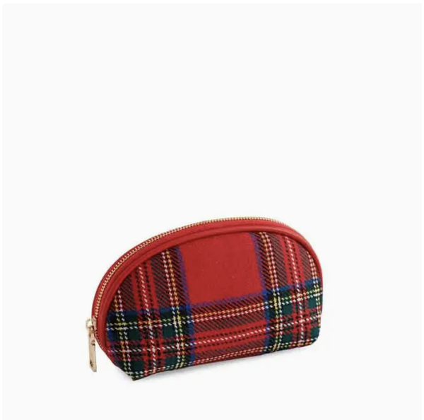 Bring a dash of cozy charm to your routine with the Scottie Zip Pouch. Featuring a classic plaid pattern in either bold red or navy, this compact cutie is perfect for stashing your everyday essentials. Its curved silhouette and gold zipper add a touch of polish, making it a stylish sidekick whether you're heading to work or out on a holiday adventure. Toss it in your tote or carry it solo—this pouch is as versatile as it is adorable.