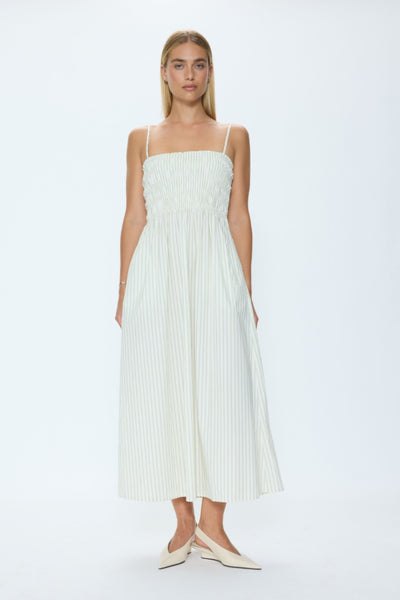 Sweet treat. Breezy day dress crafted from a flowing, lightweight fabrication designed for warm weather wear. Smocked bodice with ruched design details, topped with adjustable shoulder straps.